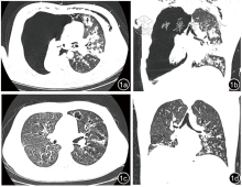 图1. 患者入院后胸部CT。图a、b为2024-01-08胸部CT。图a为轴位CT示右肺大片气胸,肺组织压缩;左肺支气管扩张,管壁增厚,沿支气管见散在斑片状、片状高密度模糊影,病变内见含气囊腔;图b为冠状位CT:右肺大片气胸,肺组织压缩约90%,左肺上叶、下叶散在支气管扩张,管壁增厚,沿支气管见散在斑片状模糊影,病变内见含气囊腔。图c、d为2024-01-22胸部CT。图c为轴位CT示右肺明显复张,右肺中叶见少许扩张支气管及周围渗出改变;左肺斑片状、片状高密度模糊影范围明显缩小,囊腔边缘边界清楚;图d为冠状位CT:右肺明显复张,右肺下叶见少许扩张支气管及周围渗出改变;左肺上叶舌段、下叶见小斑片状模糊影